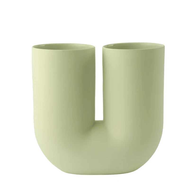 Die Kink Vase H26,3 Light Green von Muuto ist eine moderne Interpretation des klassischen Blumentopfs. Die aus Steingut gefertigte Vase kombiniert traditionelle Handwerkskunst mit einem verspielten Design, das eine einzigartige Ästhetik in Ihrem Zuhause schafft. Die doppelte Öffnung fügt eine skulpturale Dimension hinzu, die die Vase selbst im leeren Zustand zu einem Kunstwerk macht. Die satinierte Oberfläche sorgt für ein raffiniertes und haptisches Erlebnis, das den modernen Look der Vase unterstreicht. Mit einer Höhe von 26,3 cm ist die grüne Vase ideal für die Präsentation von Blumenarrangements, aber auch als Blickfang auf dem Boden oder als dekoratives Detail auf Regalen, Tischen und Fensterbänken. Wo auch immer Sie sie platzieren, die Kink Vase von Muuto wird Ihrem Raum Eleganz und Stil verleihen.