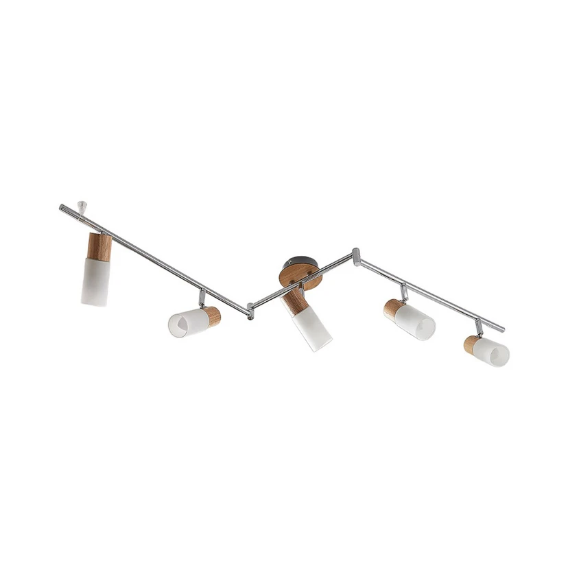 Fünfflammiger Deckenstrahler mit Holzdetails und Schirmen aus weißem Glas