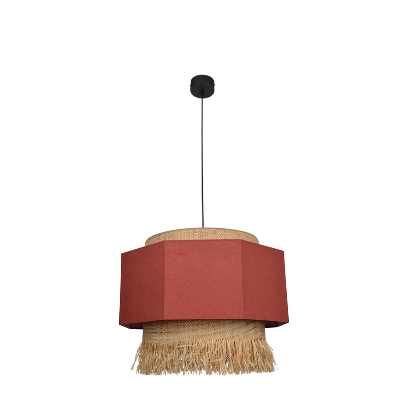 Die MARKET SET Marrakech Hängeleuchte vereint kunstvolles Design mit natürlichen Materialien wie Leinentextil, Bananenstaudefaser und Palmfaser (Raffia). Die harmonische Kombination aus massala-rotem und naturbeigem Farbton verleiht jedem Raum eine warme und einladende Atmosphäre. Die Leuchte wurde mit höchster Sorgfalt in Europa gefertigt und überzeugt durch ihre hochwertige Verarbeitung und zeitlose Eleganz.