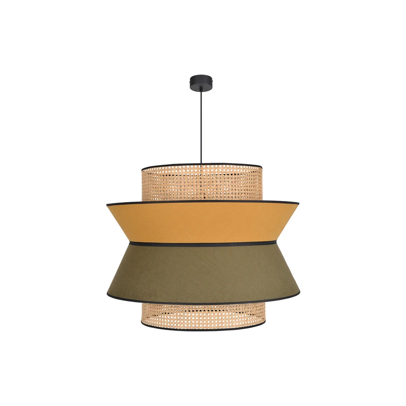 Die MARKET SET Singapour XXL Hängeleuchte vereint zeitloses Design mit hochwertigen Materialien wie Textil, Rattan und Metall. Die harmonische Farbkombination aus Khaki, Curry, hellem Holz und Schwarz sorgt für ein warmes und einladendes Ambiente. Mit ihrem großzügigen Schirmdesign wird sie zum Blickfang in Wohn-, Ess- oder Schlafzimmern und setzt stilvolle Akzente in jeder Umgebung.
