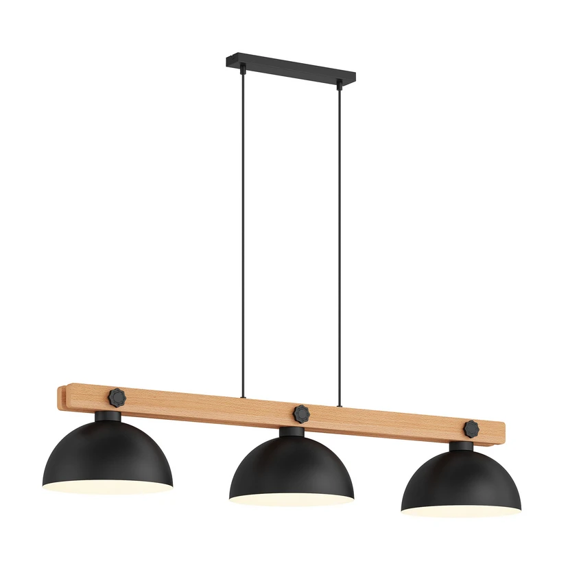Die Pendelleuchte Stort besteht aus einem langen Naturholz-Element, an dem drei halbrunde Schirme aus Metall angebracht sind. Diese schwarz gestalteten Schirme können im Holzelement geschwenkt und mittels Feststellschrauben fixiert werden. Durch ihre lichtundurchlässige Verarbeitung wird das gesamte Licht nach unten orientiert und eignet sich dadurch ideal zur gezielten Ausleuchtung von Esstischen. Die Leuchte wird in nachhaltiger Verpackung ohne Plastik geliefert.