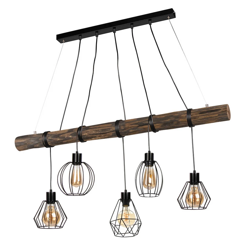 Mit ihrem interessanten Crossover aus moderner und rustikaler Gestaltung wird die Pendelleuchte Various zum Highlight über dem Tisch im Wohn- oder Esszimmer. Fünf offene Käfigschirme aus schwarzen Metallstreben laden dazu ein, mit den dekorativen Leuchtmitteln der Wahl bestückt zu werden. Die Schirme hängen an schwarzen Kabeln, welche über einen massiven Balken aus dunkel gebeiztem Kiefernholz geschwungen sind. Dies ermöglicht die individuelle Anpassung der Abpendelhöhe jedes Schirms.